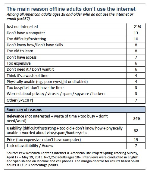 - 34 percent of non-Internet users think the Internet is just not relevant to them, saying they are not interested, do not want to use it, or have no need for it.