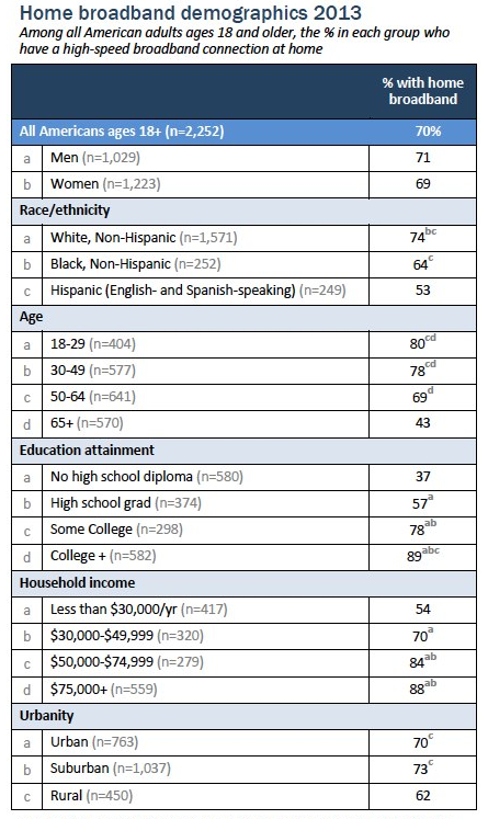 “Groups with the highest rates of home broadband adoption continue to be college graduates, adults under age 50, and adults living in households earning at least $50,000, as well as whites and adults living in urban or suburban areas,” notes Pew Research.