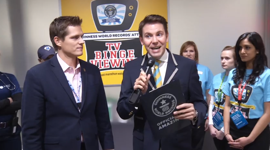 According to The Wall Street Journal, “After they broke the existing record, as previously recorded by the Guinness World Records people, the EMTs took the watchers away since they didn’t want them driving, a TiVo spokesman said.”