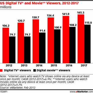 “The number of U.S. digital TV viewers will reach 145.3 million in 2017, up from 106.2 million in 2012,” according to the eMarketer report. “The February 2013 figures represent increases ranging from 5.3 percent to 9.3 percent more than the corresponding figures in its August 2012 forecast. Digital TV viewers will cross a critical tipping point in 2014, surpassing 50 percent of the U.S. Internet user population.”