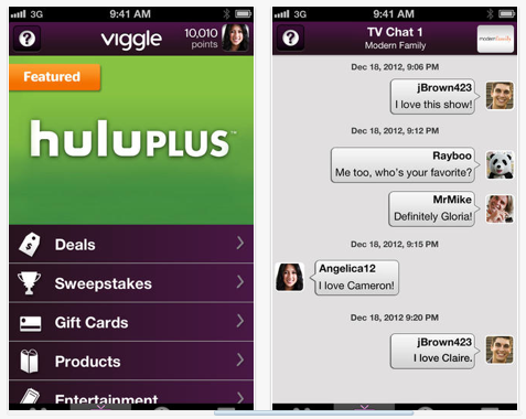 “Viggle is a loyalty program for television that gives people real rewards for checking into the television shows they are watching,” according to the company’s CrunchBase profile. “Available for Android, Apple iPhone, iPad and iPod touch, Viggle automatically identifies the television shows its users are watching and awards them points when they check-in. Viggle users can redeem their points in the app’s rewards catalogue for items such as movie tickets, music, gift cards or they can convert them into charitable donations.”